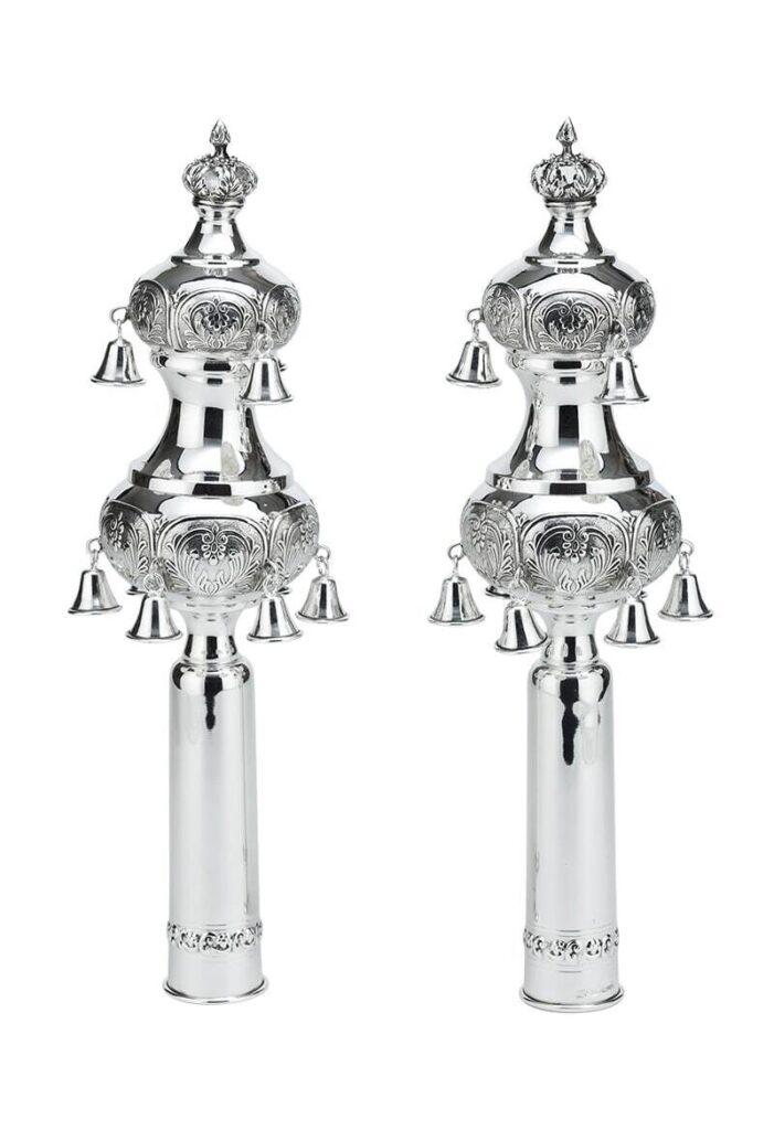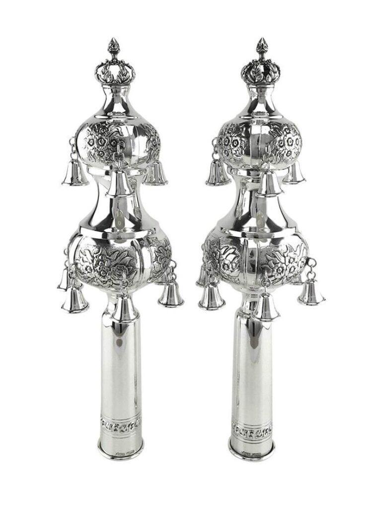 Set of silver rimonim for sefer torah - tapered diagonal flourish