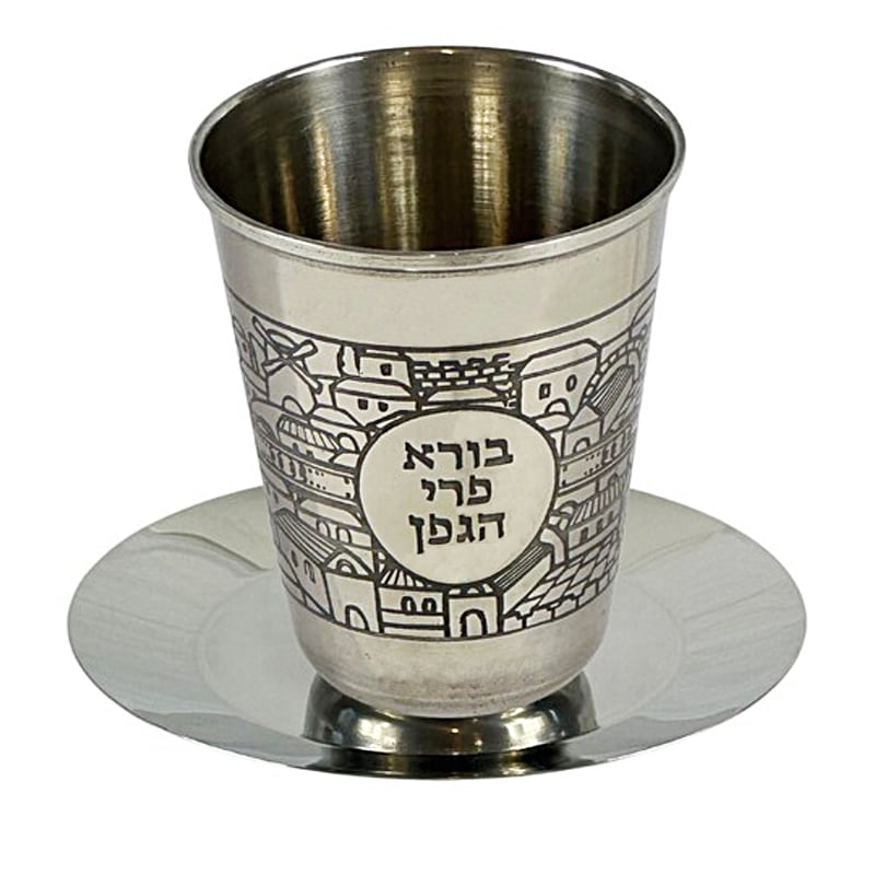 TIMELESS SHABBAT ELEGANCE. This beautifully crafted stainless steel kiddush cup brings both durability and tradition to your Shabbat table with its laser-engraved Jerusalem design.
