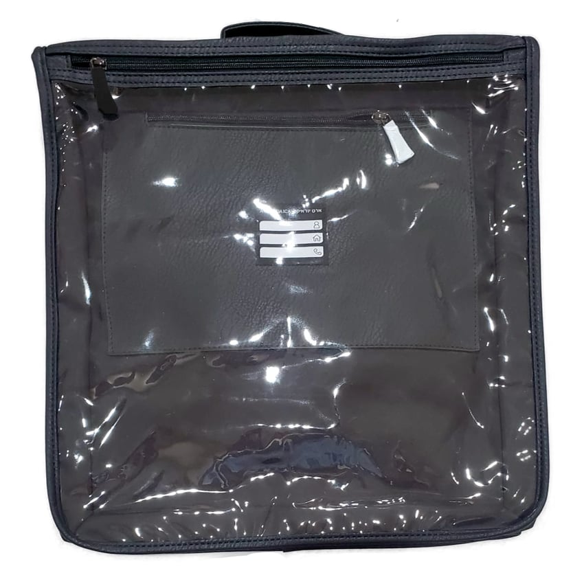 A Tik Talit Tote Bag is a protective carrying bag designed to safely store and transport your tallit, tefillin bag, and other prayer essentials. This tote bag helps protect sacred Judaica items from dust, moisture, and wear while traveling or commuting to synagogue. The transparent front panel allows you to keep your velvet tallit bag visible while adding an extra protective layer, making it both practical and respectful for storing items used in daily tefillah.