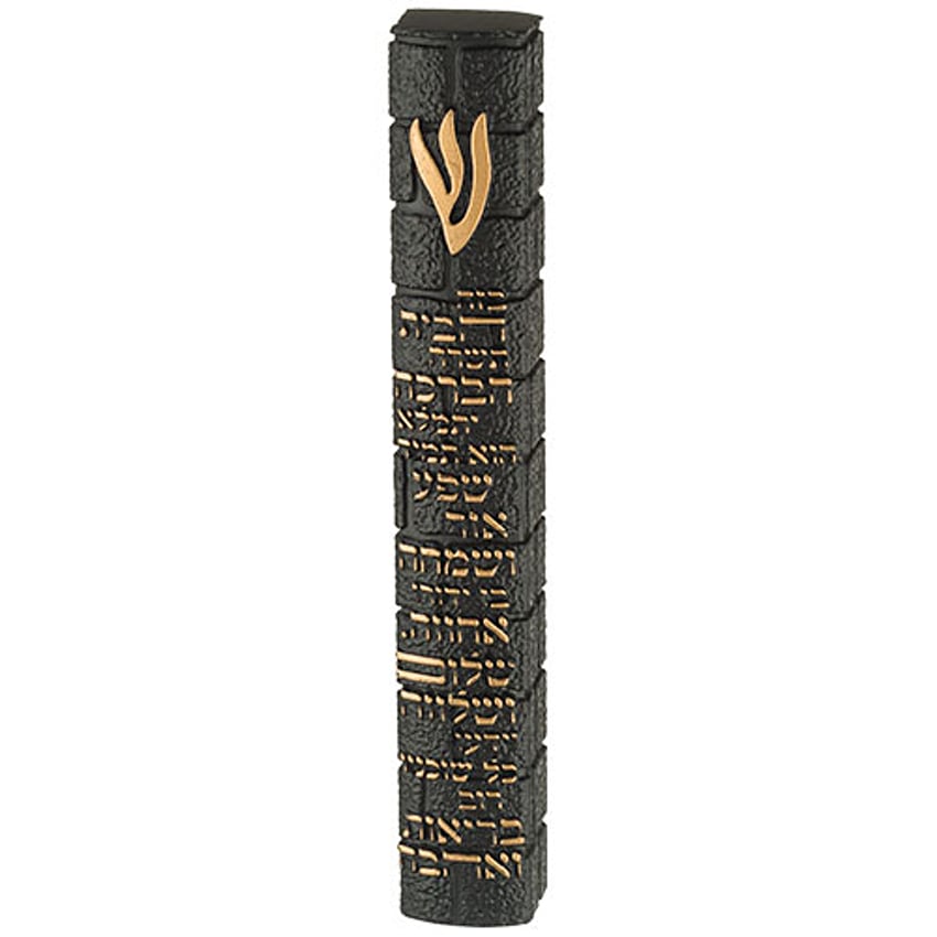 STUNNING KOTEL STONE DESIGN: This large black polymer Mezuzah case showcases a beautiful modern Kotel Stone pattern overlayed with the text of Birkat HaBayit in 3D Gold Letters that adds timeless beauty to any doorway.