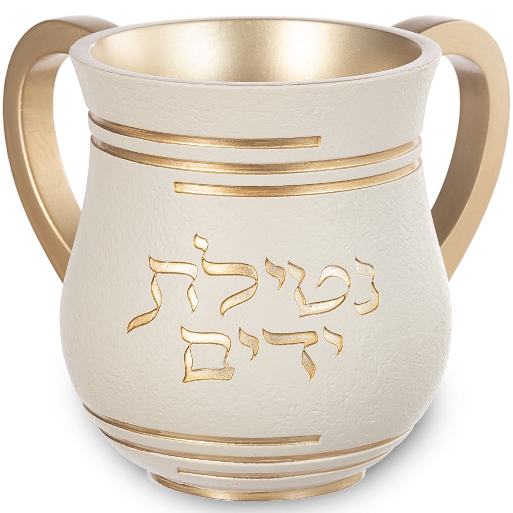 Elevate your hand washing with this exquisite netilat yadayim cup. Crafted from high-quality white polyresin, this washing cup is both elegant and durable, ensuring it can withstand regular use without losing its  appeal.